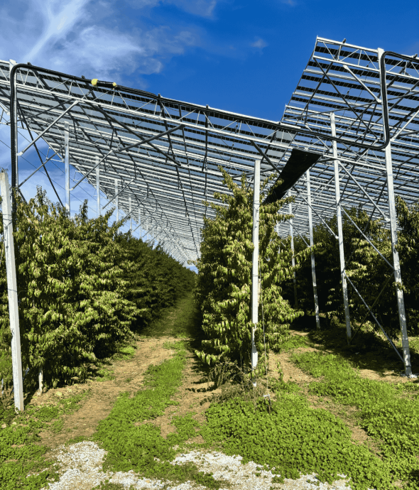▪️ Kolik světla panely propouštějí? Úroveň propustnosti je variabilní a nastavuje ji Brite Solar podle typu plodiny a místních podmínek. Pro broskvoně v Imathii byla zvolena 69% propustnost, která zajišťuje rovnováhu mezi stínem, ochranou a fotosyntézou.
